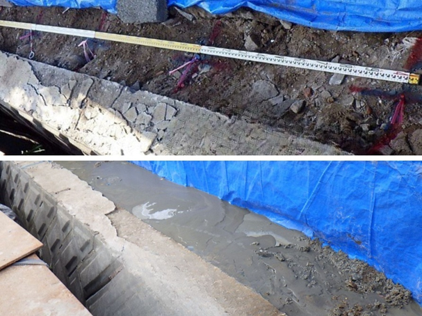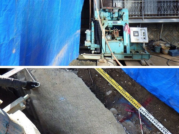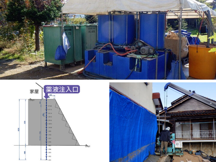 工事概要 | 能登半島地震により住宅に近接する擁壁背面の地盤が緩み、部分的な空洞やひび割れが発生し地盤の支持力が不安定になっていました。建物の壁と擁壁の間は90cm以下で、施工機械が小さい工法として、セメント系懸濁型の薬液注入工が選定されました。 |