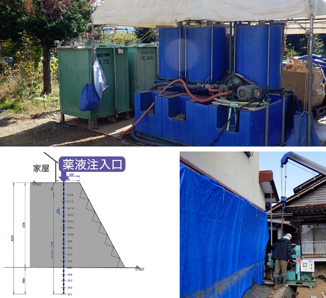 工事概要 | 能登半島地震により住宅に近接する擁壁背面の地盤が緩み、部分的な空洞やひび割れが発生し地盤の支持力が不安定になっていました。建物の壁と擁壁の間は90cm以下で、施工機械が小さい工法として、セメント系懸濁型の薬液注入工が選定されました。 |