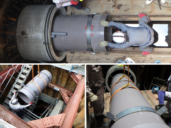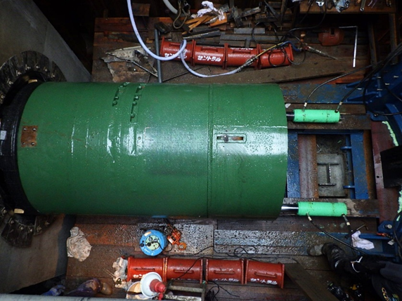 | 工事概要 | 推進工は、管路上部の土を掘らずに効率的に管路を地下に構築できる工法です。まず、さや管としてHP管φ1100を推進工法で施工し、その内側に農業用のFRPM 本管φ800を挿入します。本現場は50cmの玉石混りの土質だったため、泥濃式という礫層に適した推進工法が採用されました。 |
