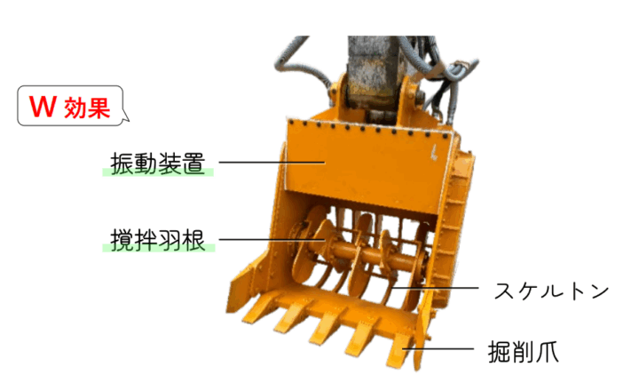 「ダイナWミキシング工法バイブロ・バケット型(VB)」は、0.45~0.7級のバックホウで施工できる深度2~4m程度に適した中層改良です。振動機付きのバケットミキサーで固化材を撹拌混合し、ブロック状の均質な改良体を築造します。