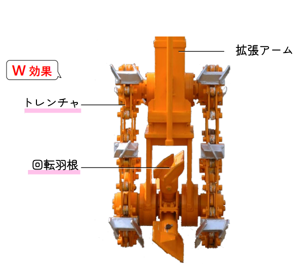 「ダイナWミキシング工法 ショート・トレンチャ型(ST)」は、①高さ約2mのトレンチャ部と ②その間に配置した回転羽根 の2つの機構により、共廻を防止し均一な改良体が築造できます。